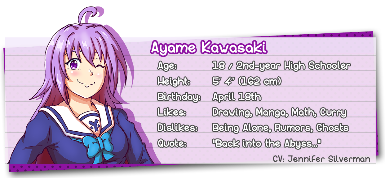 Ayame has a big heart and loves food and manga almost as much as she loves her friends and family. However, her quirky and spontaneous personality has always made her an easy target for bullies. Ayame's depression and anxiety take a turn for the worse following her mother's suicide. After taking a year off, Ayame is finally ready to confront reality— for better or worse.