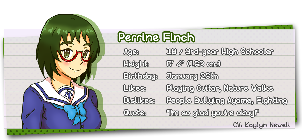 Perrine is Ayame and Miamo's childhood friend. She’s generally shy and reserved, but very energetic and lively around close friends. She believes in the goodness of others and can be too trusting of them. She finds herself in a new crowd after Ayame's year off from school, but Ayame still holds a special place in her heart.