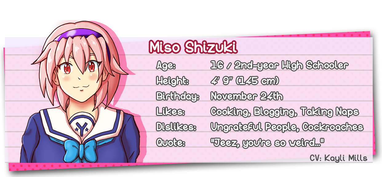 Miso is Ayame's classmate and first friend after she returns to school. She’s a fun-loving, caring, and playful girl with zero tolerance for nonsense. She brings out the best in others and puts smiles on people's faces. Cooking is her life passion, and she loves sharing her food with others. She volunteers in her free time to help the poor.